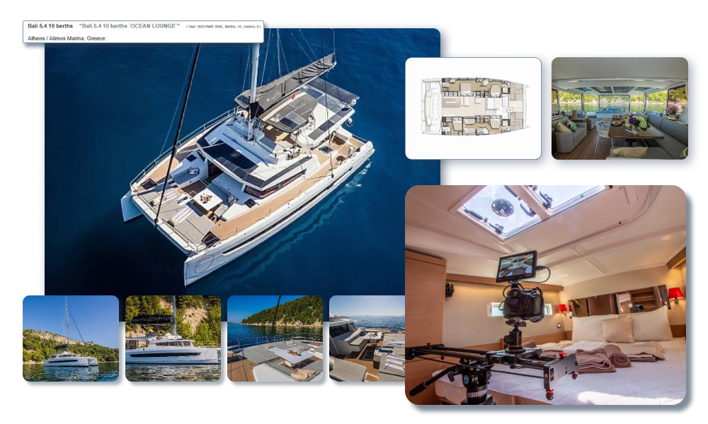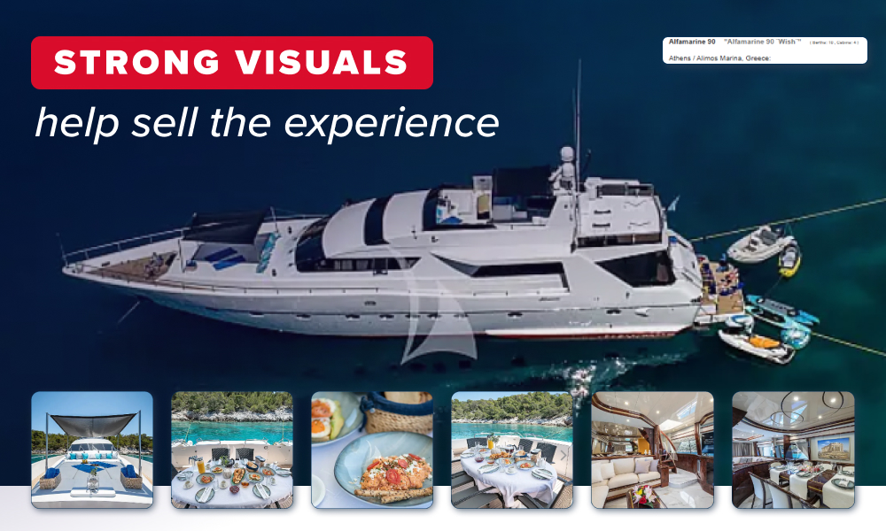 When you use real, professional photos of each specific yacht, you are building far more trust with potential guests and the agent. They get to see the exact layout, wood and upholstery colour, and what they see is more real and tangible. The ideal way to get the guest to decide and put down a deposit.