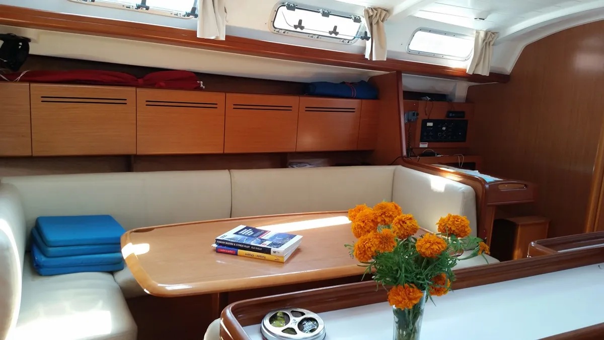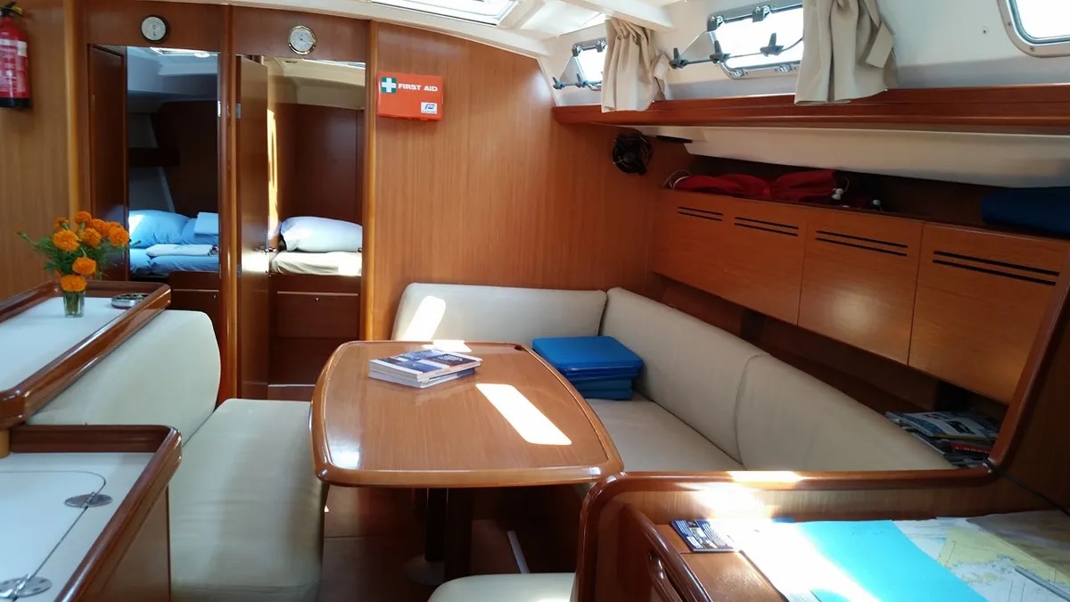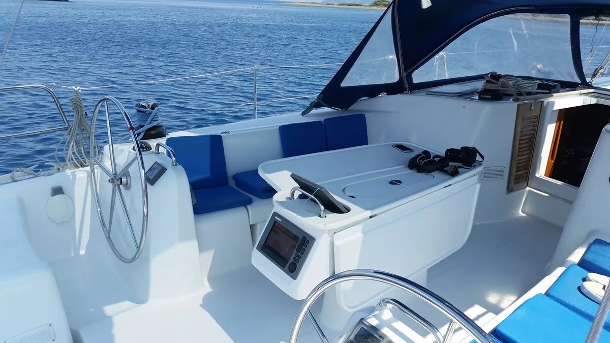 Steering wheel (2), Solar panels, Full battened mainsail, Led lighting in cabins and saloon, Shades for window and ports, Shades in screen for hatches, Delta anchor, Battery Charger + Wire, Electric Bilge Pump, 12V, 220V Socket, Deck Shower, Swimming Ladder, Gangway, Galley Equipment, Tools, Gas Bottle, Ships Licence, Sail Repair Kit, Diving Mask, Flippers, Holding Tank, Oven, Aditional Hatches, Bimini, Sprayhood, Cockpit Speakers, Dinghy, Hot Water, Towels, Bed linen, Secure Parking, Radio CD/MP3 player, Electric Windlass, Cockpit Table, Refrigerator, Safe