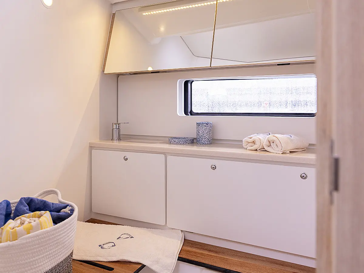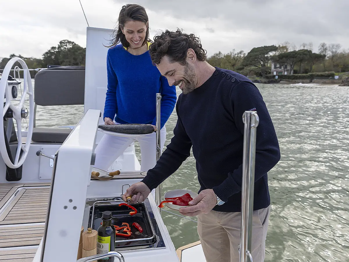 2 Steuerstände, Aluminium Gangway, Grill, Absenkbare Badeplattform (manuell), Bimini, Cockpit Kissen, Cockpitbeleuchtung LED, Cockpittisch, Sprayhood, Heckdusche (warm/kalt) (1), Wetbar